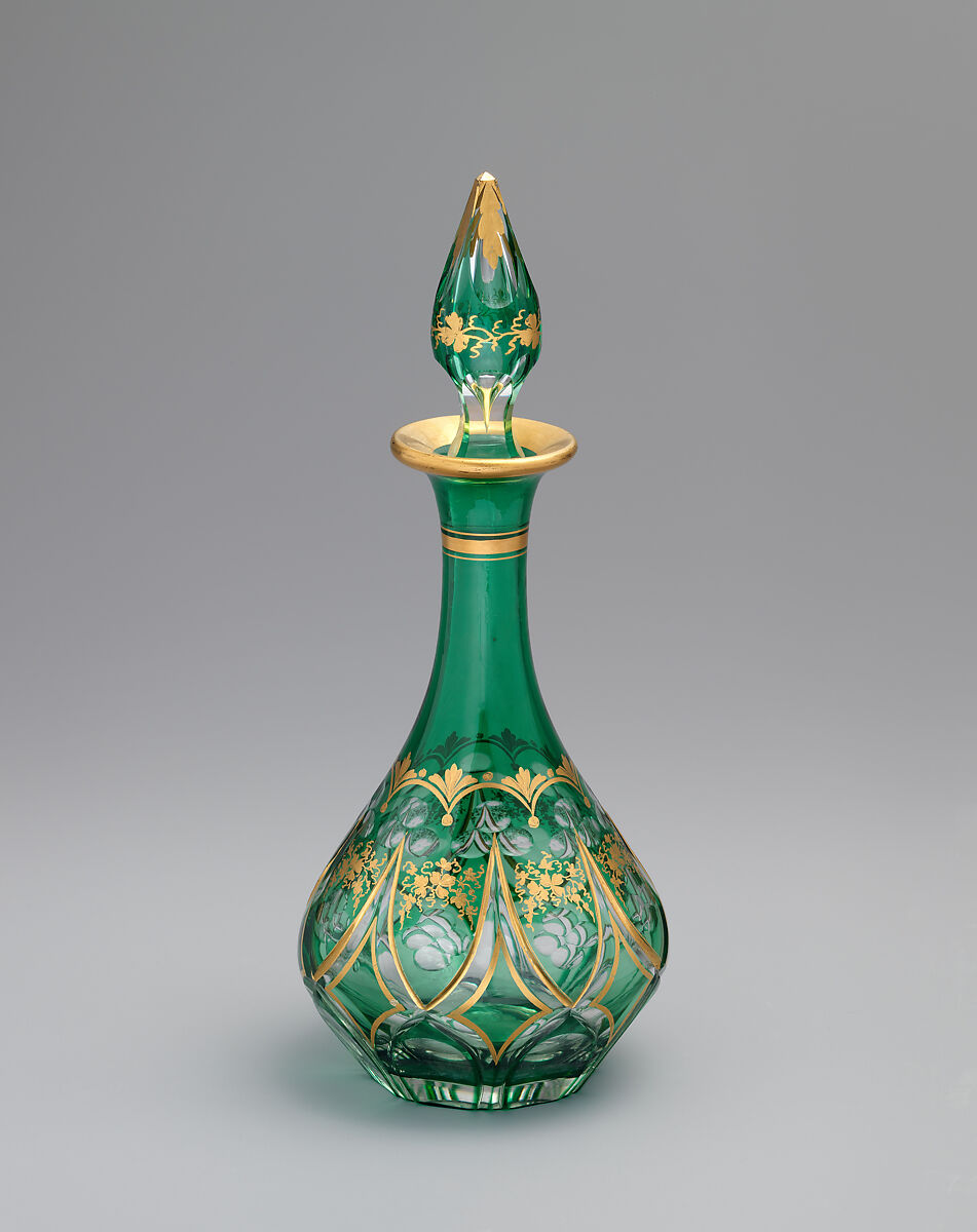 - Medium: Green cased over colorless lead glass; blown, cut and gilded