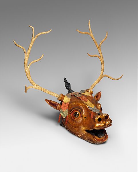 Ritual dances (cham) featuring music have always been an important part of Tibetan Buddhist practice. Stag dances are especially popular during the end-of-year Gu Tor Festival. These performances, dedicated to fierce deities, siphon malignant forces into a torma (a sculpted offering often made of butter and flour). A monk dressed as a stag cuts the torma into pieces, scattering them as he dances to rid the community of hostile forces. The large audiences that attended these dances had to see the stag costumes from afar, so they are deliberately exaggerated—the large eyes and antlers of this mask give the dancer greater stature. The elaborate Chinese silk robe, showing a dragon cavorting among clouds and waves, was likely a gift to a Tibetan monastery.
