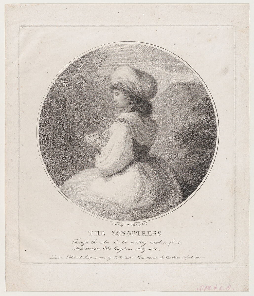 A young woman who wears a turban sits in a mountainous landscape and sings from a music book. The image illustrates "The Palace of Fortune, An Indian Tale" (1769), written by William Jones while still a student at Oxford (he later became a significant Orientalist scholar, high court judge in Calcutta, and was knighted). Little in the text relates directly to India, and Bunbury followed suit with generalized exotic elements.