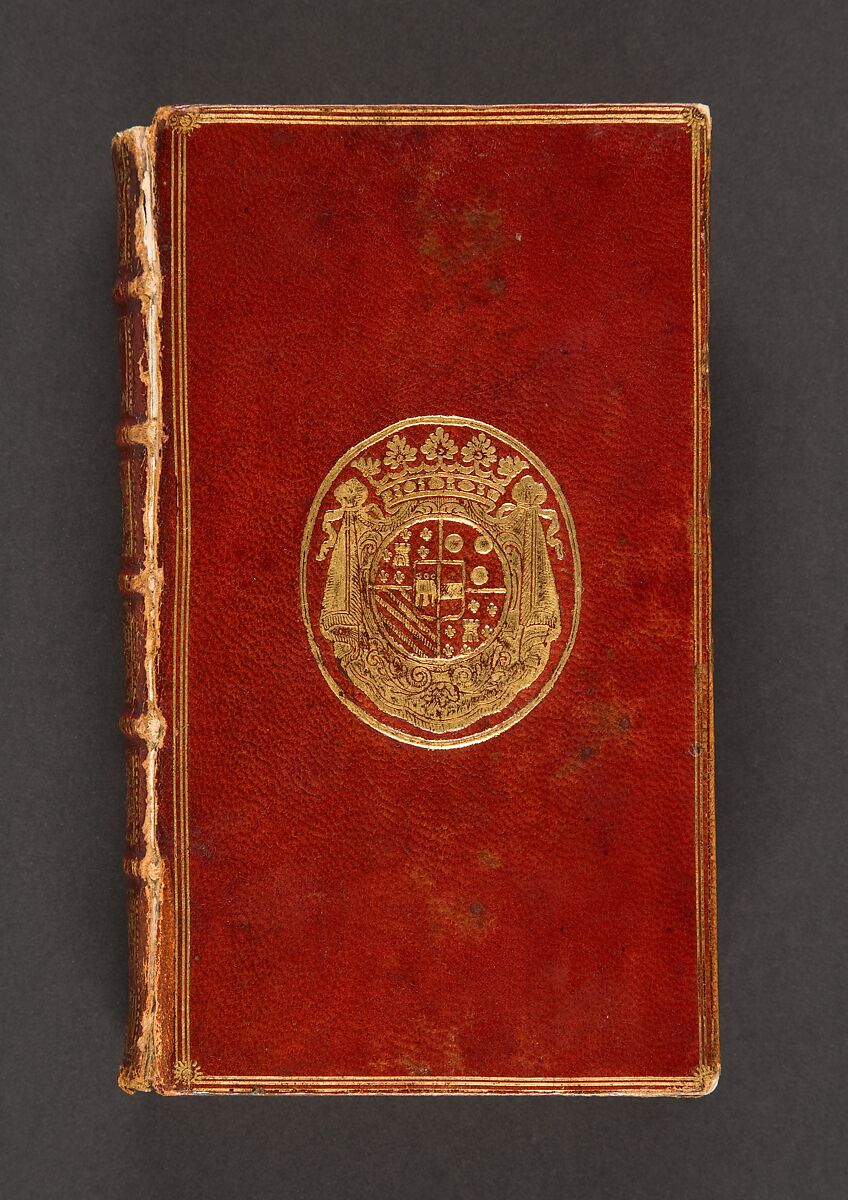 Bound as one volume in red morocco, gold-tooled, with the arms of one of the members of the De La Tour d'Auvergne family gold-stamped on both covers; triple-rule frame borders with a small sun in each corner; spine gilt in compartments with a floral design in each compartment except for that which bears the title; all edges gilt; marbled endpapers; unsigned Parisian binding, ca. 1730