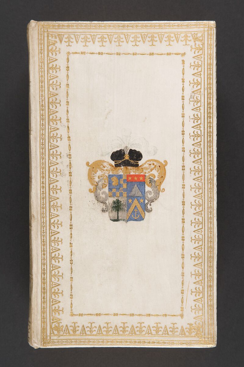 Un volume grand in-8, velin blanc. Aus armes peintes de Pierre Antoine Noel-Bruno, Comte Daru, sur le premier plat. Le second plat est orne de son chiffre couronne A.M.D. peint en vert, rose, bleu, jaune et violet.