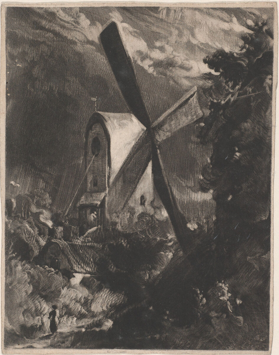View of a mill in a stormy landscape. In the bottom left foreground, a woman approaches the mill.