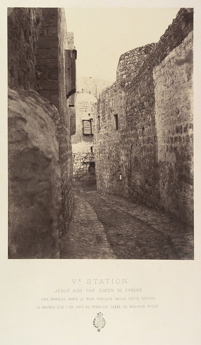 - Title: Ve Station. Jésus aidé par Simon de Cyrène. Une marque dans le mur indique seule cette station. La maison que l'on voit au fond est celle du mauvais riche