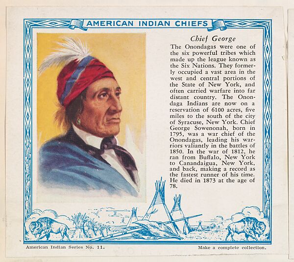 Chief George, No. 11, collector card from the American Indian Series (D6), issued by the Kelley Baking Company to promote Kelley's Bread; one of many issuers. These cards were also published as the Indian Chiefs series (T129) by Red Man Tobacco. (Album 307, page 16)