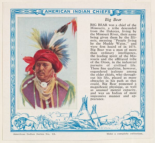 Big Bear, No. 18, collector card from the American Indian Series (D6), issued by the Kelley Baking Company to promote Kelley's Bread; one of many issuers. These cards were also published as the Indian Chiefs series (T129) by Red Man Tobacco. (Album 307, page 17)
