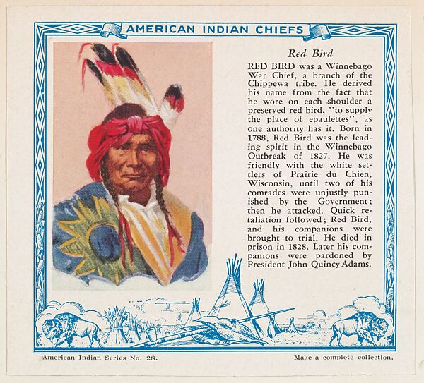 Red Bird, No. 28, collector card from the American Indian Series (D6), issued by the Kelley Baking Company to promote Kelley's Bread; one of many issuers. These cards were also published as the Indian Chiefs series (T129) by Red Man Tobacco. (Album 307, page 19)