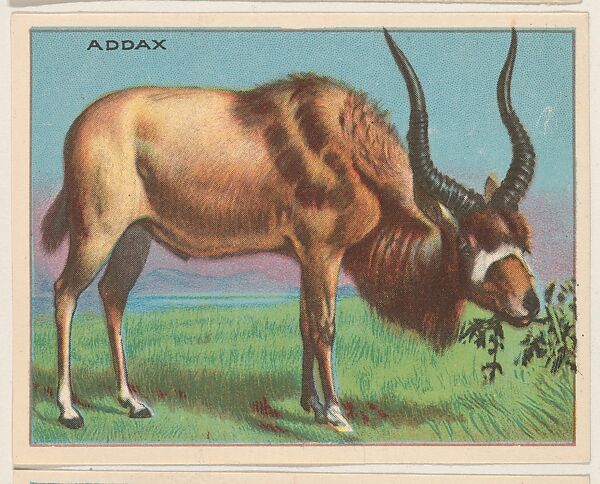 Addax, collector card from the Animals series (D9), issued by the Weber Baking Company to promote Onist Milk and Pullman Bread; 80 cards in series. These cards were also published as the Animals series (T29) by Hassan Cigarettes. (Album 307, page 21)