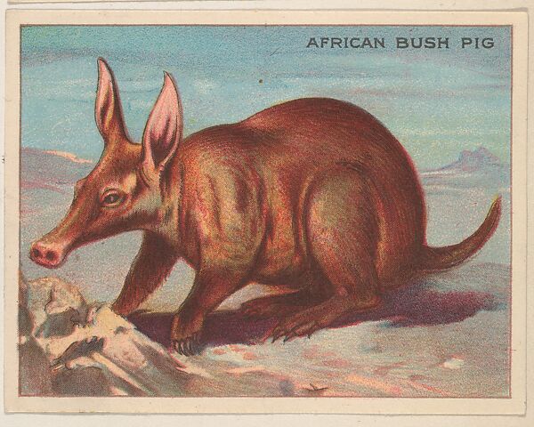 African Bush Pig, collector card from the Animals series (D9), issued by the Weber Baking Company to promote Onist Milk and Pullman Bread; 80 cards in series. These cards were also published as the Animals series (T29) by Hassan Cigarettes. (Album 307, page 21)