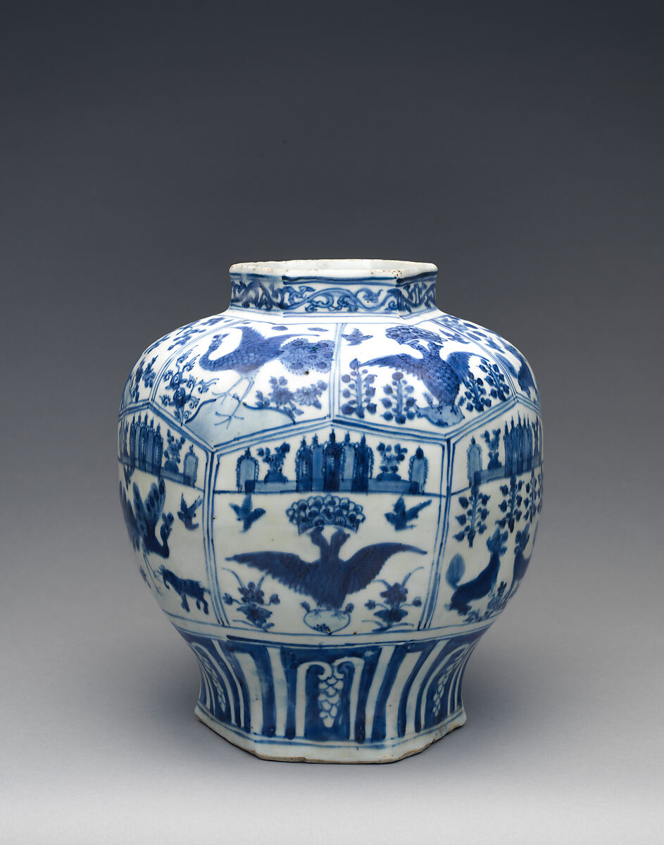 The primary motif on this jar—a double-headed eagle clutching a heart pierced with arrows—served as the emblem of the Catholic Order of Saint Augustine. In the sixteenth century, Augustinian friars established monasteries in Mexico, the Philippines, and Macau (in Southern China); the jar may have been produced for missionaries in one of these locations. While the jar probably served a functional purpose, its white porcelain body and cobalt-blue decoration would have appeared luxurious to friars accustomed to humble vessels.