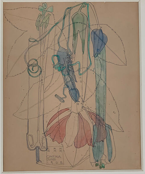 Charles Rennie Mackintosh is perhaps best known for his furniture and architectural designs. From the beginning of his career, however, he believed that art and architecture were intertwined. While he was an architectural apprentice, Mackintosh attended evening classes at the Glasgow School of Art, where he met Herbert MacNair, Frances Macdonald, who would later marry MacNair, and her sister Margaret (who would later wed Mackintosh). Together they formed "The Four," producing watercolors, poster designs, and small decorative objects. The Tacsonia watercolor is an example of the work done by Mackintosh on annual holidays he took with Margaret and, at times, the MacNairs. Margaret's initials in the cartouche on the painting are believed to indicate only that she was with Mackintosh when he painted it, not that she painted any part of it.