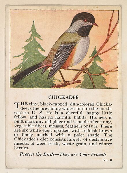 Chickadee, No. 8, collector card from the Bird Cards series (D16), issued by the Krug Baking Company to promote their product, Toastmaster Bread. Other cards in series issued by the White Baking Company for White's Whole Wheat Bread. (Album 307, page 32)