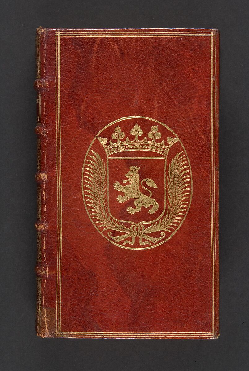 Binding: in-12, maroquin rouge, dos orne, filets dores sur les plates, armes au centre, roulette doree interieure, tranches dorees.