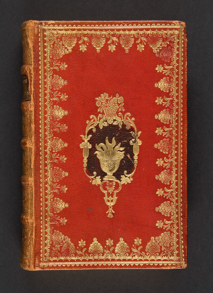 Contemporary red morocco binding with central green morocco mosaic decorated with gold-tooled vase and floral motif outlined by palmette border; combed marbled endleaves.