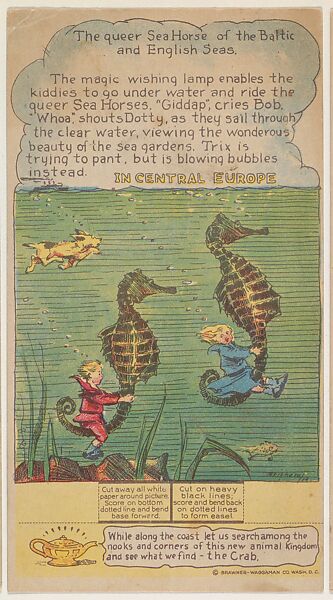 The Queer Sea Horse of the Baltic and English Seas, Central Europe, collector card from the Dotty, Bob and Trix Cards series (D27), issued by the Pryor Baking Company and distributed in loaves of Pryor's Golden Krust Bread. Issued as an additional set by the Nafziger Baking Company and included in their loaves of Butter Cream and Milk Bread. (Album 307, page 42)