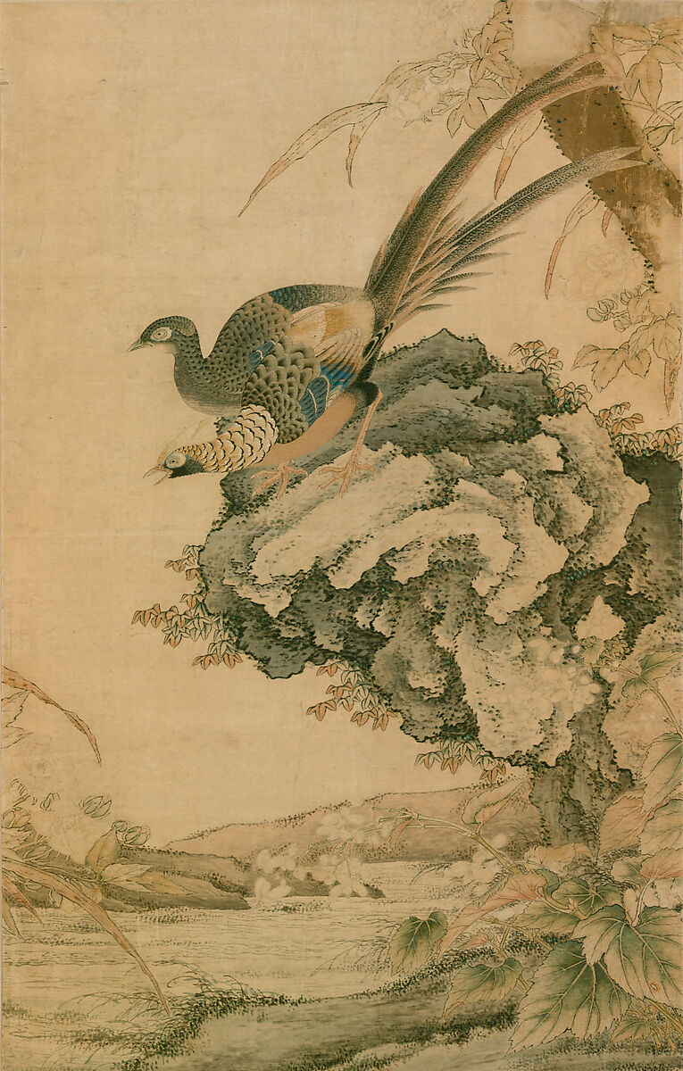 While at first glance this picture of pheasants and a distant landscape looks like a painting, it is actually silk tapestry (kesi). Beginning in the Southern Song dynasty (1127–1279) and continuing into the late Qing, faithful reproductions of paintings were made in kesi. By contrast, tapestry-woven silks with decorative patterns were produced for clothing and furnishings. By the nineteenth century, kesipictures show a change in technique: large areas are tapestry-woven in a single color and then details painted in. Here, for example, the river is a single area with painted waves and ripples. (From China, 1800–1900 A.D.)