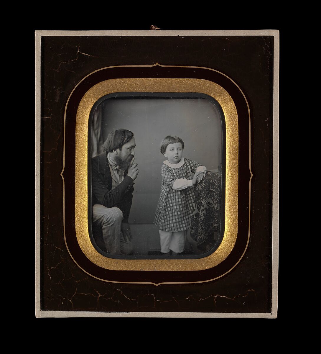 Indeed, toys, music boxes, or other treats were frequently employed to soothe frightened or fussy sitters. For fidgety children, special stands and chairs meant to hold the child in place were used. Children were photographed in the strongest light possible to decrease exposure time, and thus the time needed to sit still. Another daguerreotypist advised, "Have two or three plates at hand, and as soon as the child is placed, when parents, nurse, and all present, are talking, laughing, and baby is struck dumb with surprise at its strange position, then is the golden moment…" This daguerreotype captures not only one such "golden moment," but reveals a behind-the-scenes glimpse at the effort required to produce it. This touching portrait reveals what was typically kept out of frame: the relationship between parent and child, a proud father calming and coaxing his son into posing for the camera. Both a reflection on familial bonds and photographic practice, it is a rare example of daguerreotype studio portraiture.