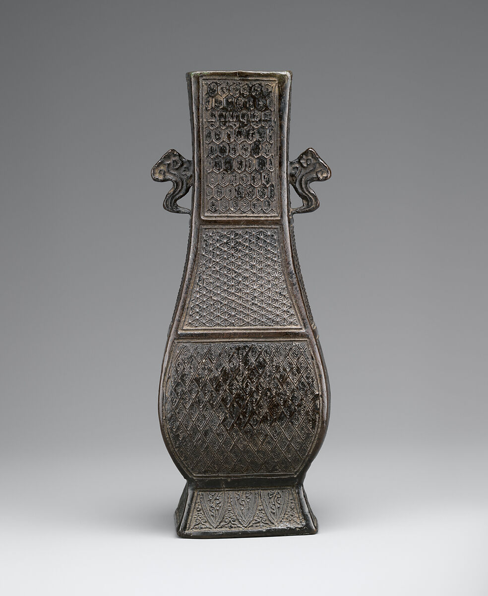 This slender vase has a rectangular section on a splayed foot, with two cloud-shaped handles attached to the sides of its neck. All four sides of the vase are decorated, from neck to foot, with geometric patterns, including honeycomb diaper, floret-and-dots diaper, diamond diaper, and pendant lappets. The entire vessel is covered with a warm blackish patina that bears no trace of being buried underground.