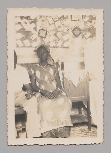 The amateur photographer who took this image likely experimented with the medium during his leisure time, capturing his friends and relatives at social gatherings and special occasions. Among the dozen vintage prints that have survived from this series, several present individuals posing in front of walls crammed with small prints, some of which are attached to wood panels, while others are placed in wood frames. These portraits, taken in the interiors of the sitters’ homes, attest to the ubiquity of photography in Saint-Louis in the interwar period.
