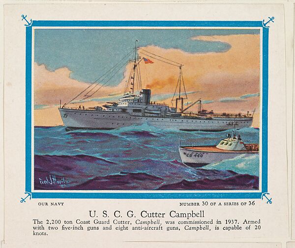 - Title: No. 30, U. S. C. G. Cutter Campbell, collector card from the Our Navy series (D62), issued by the Kelley Baking Company