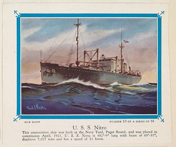- Title: No. 10, U. S. S. Nitro, collector card from the Our Navy series (D62), issued by the Kelley Baking Company