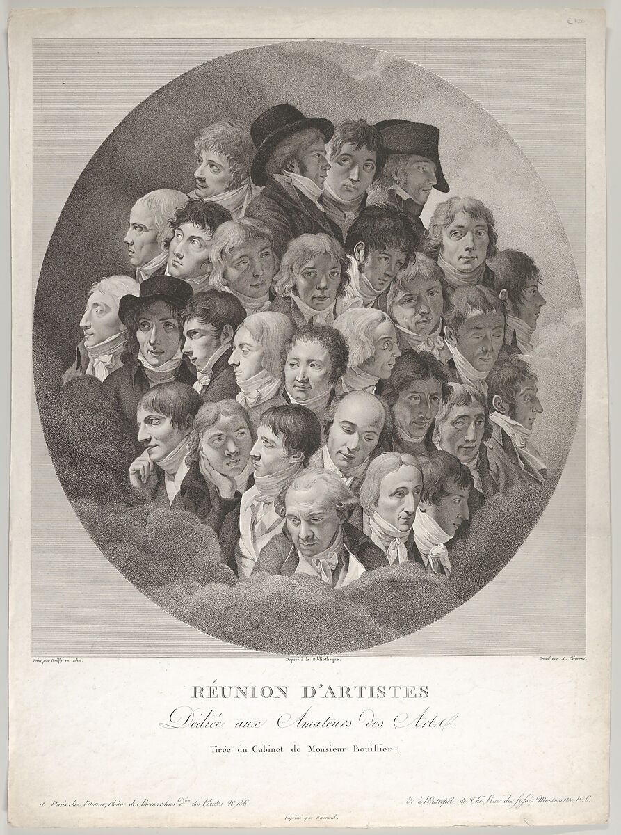 This print reflects the popularity of Boilly’s painting, Reunion of Artists in Isabey’s Studio (1798, Musée du Louvre, Paris). Grouped into an oval surround, the 29 heads are portraits of artists, architects, and actors, all well-known figures of the day.