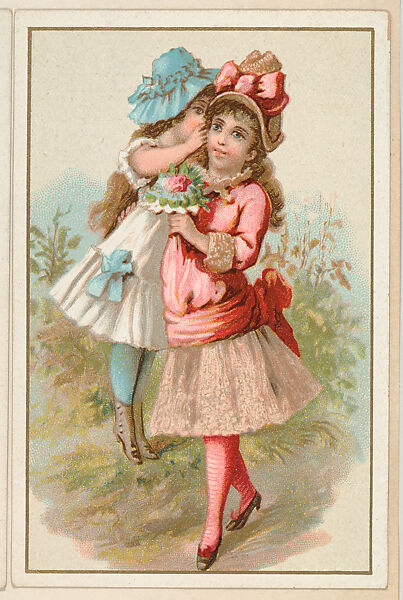 Two girls whispering, bakery card from the Picture Cards series (D63), issued by the Vienna Model Bakery, which was owned and operated by Fleischmann's Bakery, and distributed in loaves of Miss Wentworth's Home-Made Bread. This series was also published by several other bakeries. (Album 307, page 95)