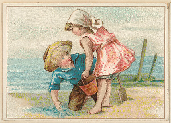 Two children playing in the sand, bakery card from the Picture Cards series (D63), issued by the Vienna Model Bakery, which was owned and operated by Fleischmann's Bakery, and distributed in loaves of Miss Wentworth's Home-Made Bread. This series was also published by several other bakeries. (Album 307, page 96)