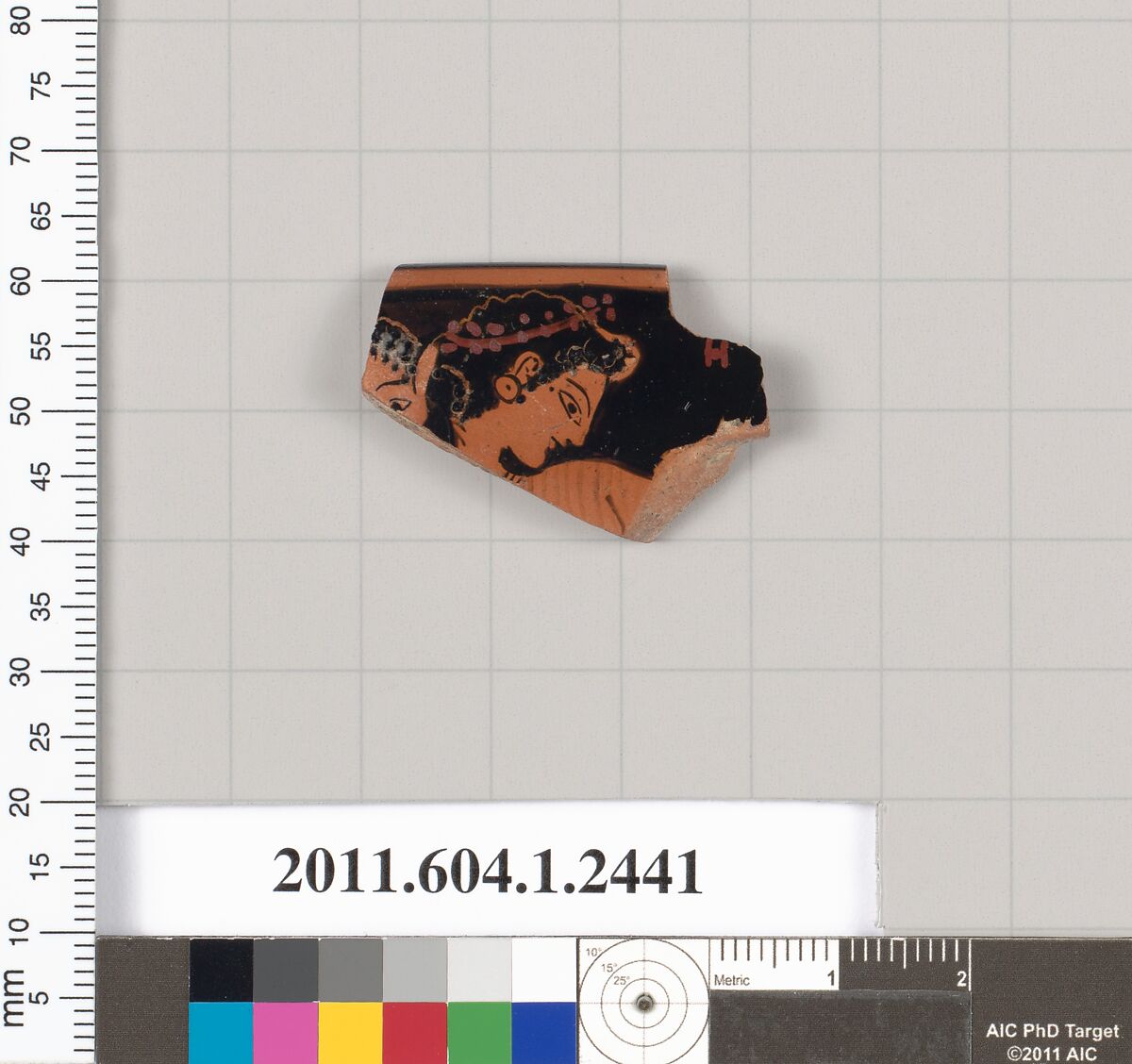 Exterior, part of frontal face of satyr; head of wreathed maenad with chiton; to the right of the maenad's head, part of an inscription, an H