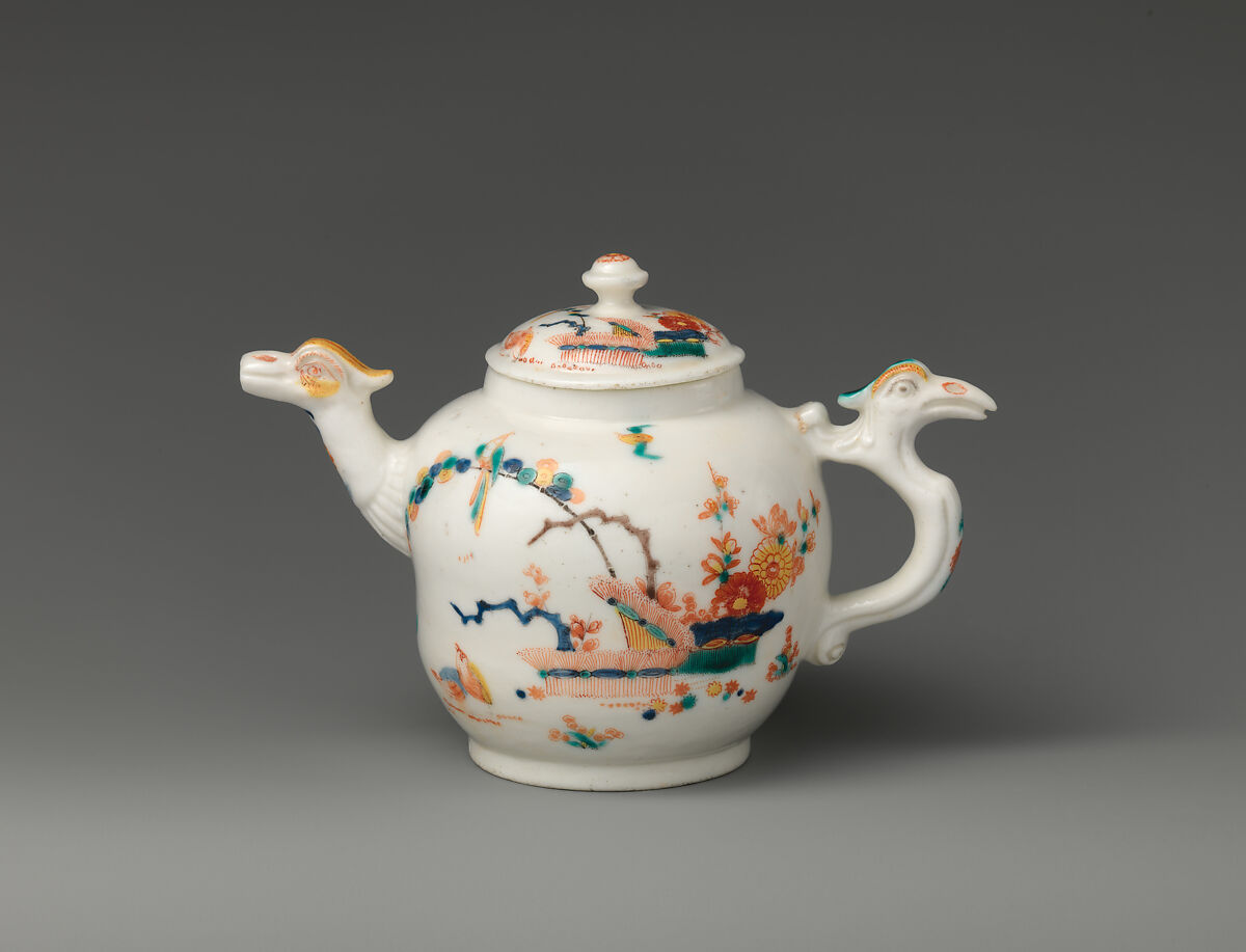 This teapot, one of the most popular models produced at Saint-Cloud, is an important example of Saint-Cloud porcelain decorated in the Japanese Kakiemon taste, and its early date is indicated by the evident technical challenges, which include slight warping of the soft-paste body and the fusion of some of the enamel colors with the clear lead glaze. Another Saint-Cloud teapot of the same model in the Museum's collection (2004.354a, b) bears decoration that was left unfinished due to a firing problem that affected the join of the spout to the body. The preliminary stages of decoration executed in blue, green, yellow, and manganese on this example indicate that the completed decoration would have been extremely close to that found on the present example. The teapot donated in 2004 serves as an effective teaching tool to demonstrate the stages of decoration involved for soft-paste porcelain; this teapot allows us to illustrate the intended finished product. The addition of both red and black enamel that would have occurred in the final firing of the incomplete teapot makes the compositions legible.