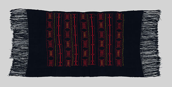 This embroidered Dogon shawl, from Mali is composed of seven bands. Made of handspun cotton, it is dyed in deep indigo and appears almost black. The red and yellow cotton embroidered geometric patterns are developed on six of the seven bands. Collected in Mali in the 1960s, it is a mid-century example of an important West African textile tradition.