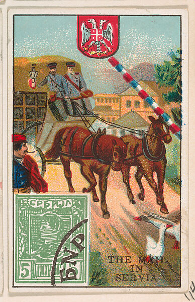 - Title: The Mail in Servia, bakery card from the Stamps and Mail Carriers of All Nations series (D73), issued by the Rochester Baking Company