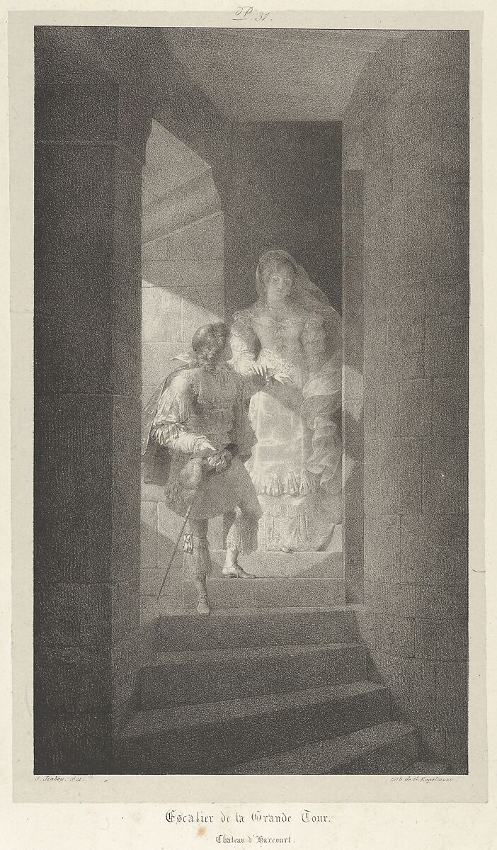 A man, holding a cane and hat in one hand, helps a woman down a limestone stairway which is lit from the left by a ray of light that pours onto the figures through a small arrow-slit window. Both figures are dressed in Louis XIV style clothing. The stairwell depicted here is located in the Harcourt castle (Lillebonne, France).This print was part of a series entitled 'Voyages pittoresques et romantiques dans l'ancienne France' which is a survey of France's national heritage conducted by Charles Nodier, Baron Taylor and Alphonse de Cailleux, and is abundantly illustrated by lithographs. This ambitious project, which required sending about a hundred artists to different regions of France, was published in a series of twenty-one volumes between 1821 and 1878.