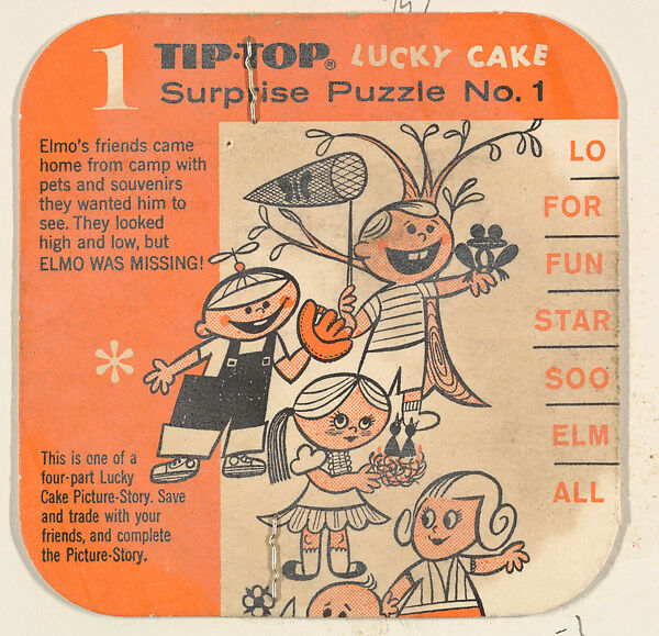 Surprise Puzzle No. 1, bakery card from the Lucky Cake Surprise Cards series (D94-1), issued by Tip Top Bakeries as a set of cards depicting stories and games relating to the character "Elmo Topp." (Album 307, page 120)