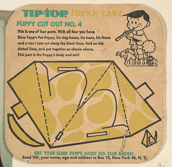 Puppy Cut Out No. 4, bakery card from the Lucky Cake Surprise Cards series (D94-1), issued by Tip Top Bakeries as a set of cards depicting stories and games relating to the character "Elmo Topp." (Album 307, page 120)
