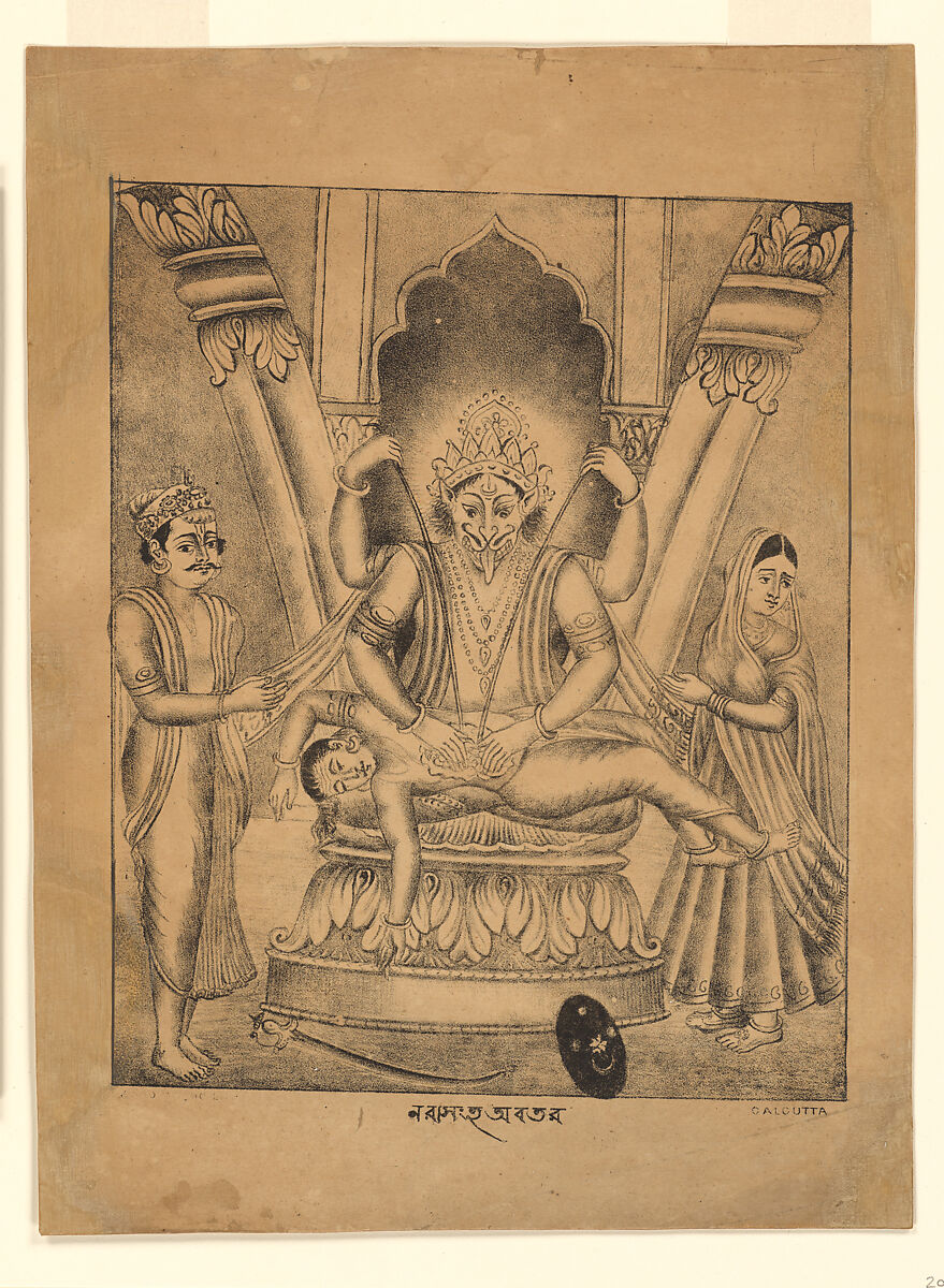 This monochromatic lithograph was printed in one of the first printing workshops in Kolkata (Calcutta) to produce Hindu devotional prints for commercial distribution. In this rendering, undoubtedly drawn by a trained painter, we see Vishnu’s man-lion avatar adorned with a crown revealing himself from within a pillar that has split open. The base and capital of the pillar are adorned with acanthus leaves, a detail familiar to the artist from Victorian colonial architecture in Calcutta. This rare impression may well be the earliest known popular print of this subject and was likely intended for hand-coloring.