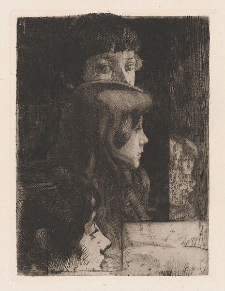 In this etching, Besnard portrayed four of his family members. The profile in the lower left foreground is that of his wife, Madame Besnard. Behind Madame Besnard is a profile view of their daughter, Germaine, and their oldest son, Robert. Philippe, the youngest boy in the family, is tucked into the lower right of the composition. The artist's youngest daughter, Jean, was only several months old at the time of this portrait and was therefore left out of the composition. Two states exists of this etching. This state was published in the July 1890 edition of the Gazette des Beaux-Arts.