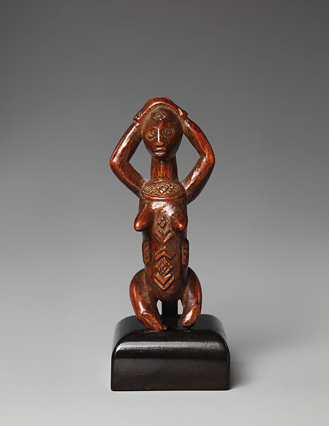 This kneeling female figure, with her arms raised and her hands resting at the top of her head, was carved from a single piece of wood. Her abdomen and upper chest are enhanced with raised cicatrices. The lower part of both legs are missing and seem to have been broken off or purposefully removed long ago. The wood was originally covered with a thin layer of black pigment or dye, now faint. The shiny layer coating the surface is of recent origin.