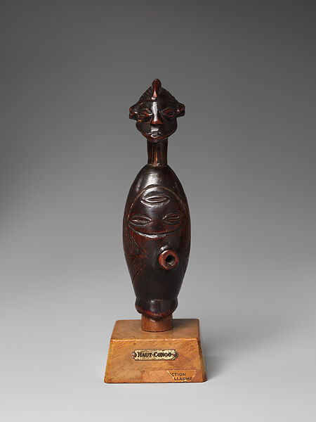 The whistle’s decorative program is at the confluence of an array of culture groups located in southwestern Democratic Republic of the Congo and northern Angola, among which are the Yaka, Suku, Mbala, and Chokwe peoples. The overall oblong shape of the body, from which extend short side protrusions and modulating holes, is typical of whistles found among the Yaka and Suku, known as ndemba; the head, however, is unusual and the coiffure relates to the neighboring Mbala. Another unusual characteristic is the extent of incised decorations on the body, including striations and stylized faces, which echo motifs found on Chokwe drums and thumb-pianos.
