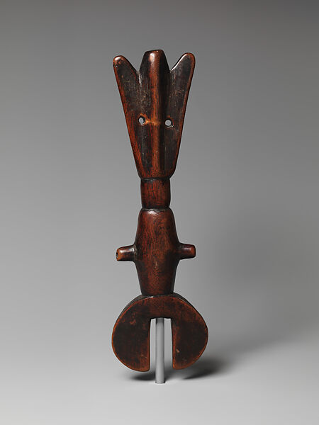 Wooden whistle such as this one are used across the Grassfields region of northwestern Cameroon, but those presenting anthropomorphic stylized features are usually played by men during a dance known as ndong. Ndong is performed when a new wife arrives at her husband’s house. On that occasion, music is supplied exclusively by this type of whistle. Whistles are usually tuned to play up to three notes and may be used alone or played in sets to produce a scale. Sound is made when a player blows air across a sharp edge — in this case between the crescent-shaped ends.