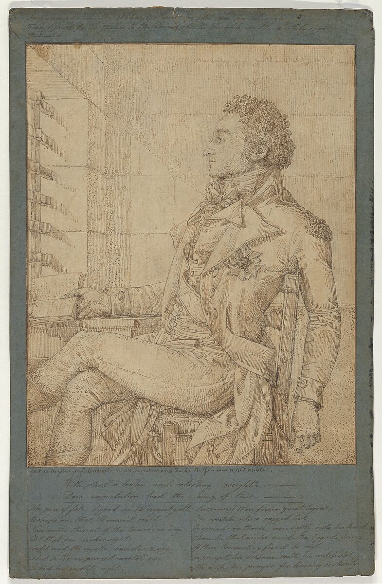 A contemporary of Prud’hon and Girodet, Hennequin was briefly in the studio of David before going to Rome. As a devoted Jacobin, he was imprisoned following the death of Robespierre. There, he made the acquaintance of William Sidney Smith (1764-1840), Commodore, and later Admiral, in the British navy who had been captured near Le Havre and would stage a daring escape two years later. After Smith had commissioned a group portrait from Hennequin (British Museum, 1963-12-14-14), the artist presented him this drawing as a gift. Smith is shown calm and collected in his naval uniform, gazing out the barred window. The following year, he would have the drawing etched by Maria Cosway (1760-1838) (National Portrait Gallery, London, NPG D6792). The technique of the drawing showcases Hennequin’s skill with pen and ink; the forms are first delineated in his characteristic taut and springy outline, and the modelling and suggestion of tone are executed in a range of marks, ranging from short hatch marks, to curlicues, to dots.