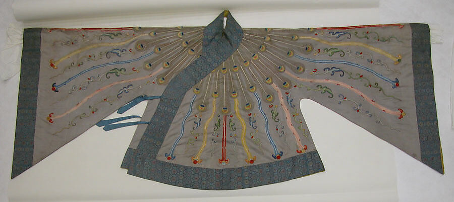 This jacket from an ensemble (with 32.63.1) features colorful embroidered peacock feathers. Silk flosses in green, yellow, blue, and orange were painstakingly twisted to mimic the feather’s patterns and radiant effects. An exotic bird to the Chinese, the peacock was cherished for its beautiful feathers and is connected with fairies or spirits in Chinese legends.