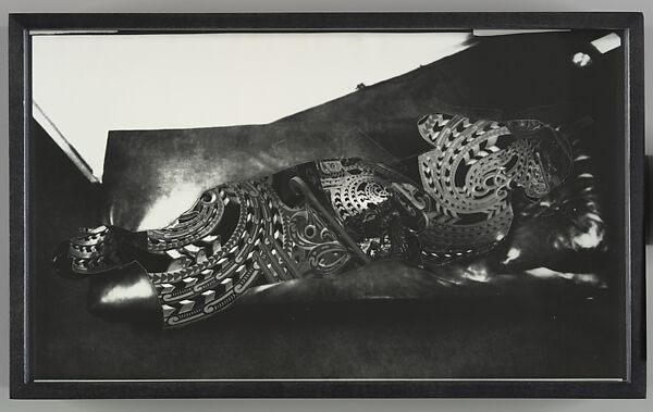 This photogram—made without a camera by placing a collage of transparencies on a photosensitive sheet of paper and exposing it to light—is part of a series portraying psychoanalysts and their patients. Here, a patient on a Freudian couch is seen from above; the figure, sheathed in patterns of Maori origin, appears to come apart at the seams under the analyst’s scrutiny.