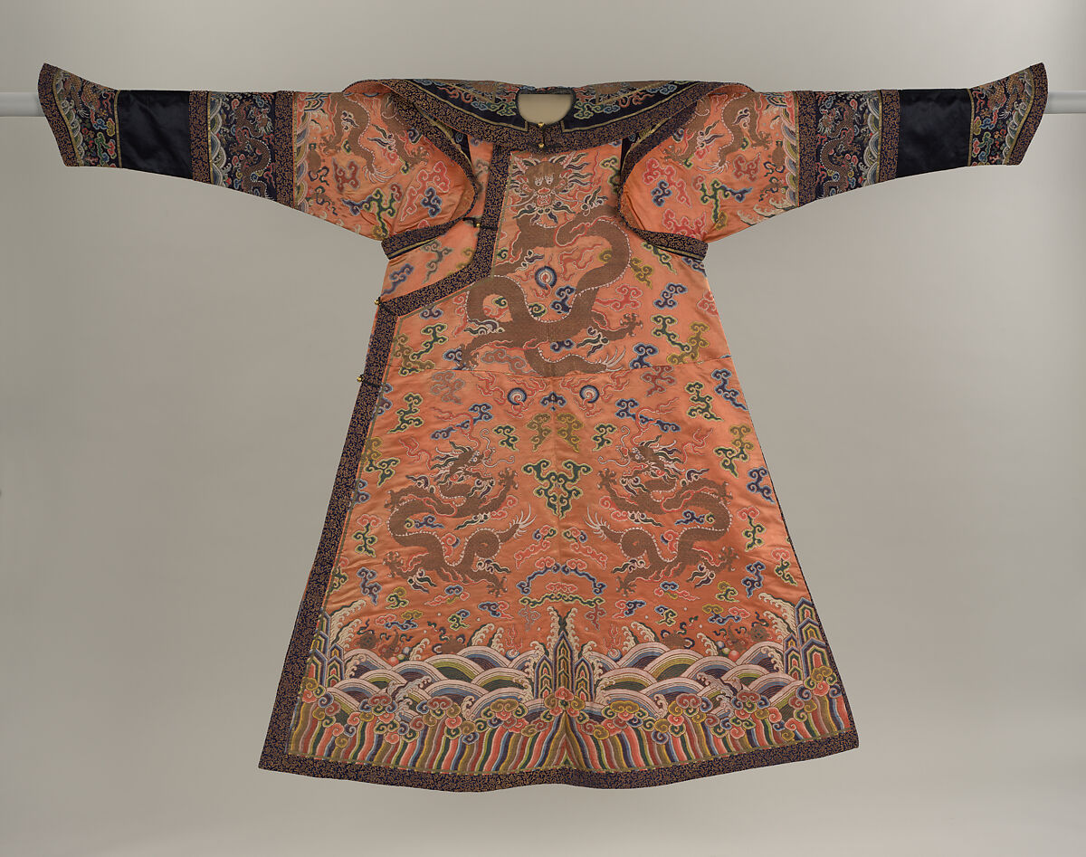 Known as chaopao, women's formal or state robes characteristically include an L-shaped seam between the collar and underarm fastenings that were most likely used to attach a long sleeveless coat over the garment.. This robe also features an attached collar, making it a complete set. Surviving examples of women's formal court robes are rare: not many were made, as women were not often included in court ceremonies. The unusual orange-yellow of the robe further indicates its high status. The original color, still well preserved inside, resembles that of a ripe apricot, a color designated only for the crown prince and his consorts.