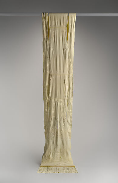 Issey Miyake introduced his APOC, or "A Piece of Cloth," apparel concept in 1997. Designed to highlight the two dimensional quality of cloth and to minimize waste, APOC garments were produced in machine made rolls of knit fabric pre-sewn or fused with finished patterns. The user cut the pattern from the roll to create a ready-made, customized garment. The modular APOC line allowed the user to determine the specifications and the components of their wardrobe. This white example is an uncut length from a larger roll.