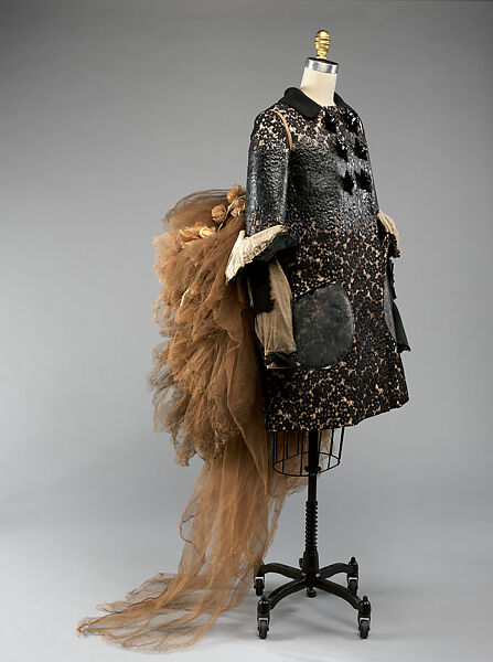 John Galliano accepted the role of creative director at Maison Margiela in 2014, five years after the retirement of founding designer Martin Margiela. The A-line coat from Galliano's debut Artisanal, or haute couture, collection is made of hand-sewn buckram appliquéd with black cotton lace and coated with black acrylic resin. It is finished with antique cotton calico cuffs, clear plastic patch pockets with deep three-pointed flaps, a bustle of brown shredded silk tulle and lace, black lacquered conch shells, and string of chandelier crystals. Accessorized by nude, padded stockings worn through at the knees, the ensemble - inspired by a threadbare doll that is losing her stuffing - represents Galliano's and Margiela's shared interests in the aesthetics and techniques of deconstruction and bricolage. Galliano's method of layering new and repurposed fabric and objects foregrounds the garment's construction, a process he describes as "ripped to reveal." His skillful use of materials and conflation of references - from the eighteenth-century pocket flaps and sleeve ruffles to the late nineteenth-century bustle - signify the enduring importance of narrative and historicism in his work and recall his earliest designs of the 1980s and years of ingenuity as creative director at Christian Dior.