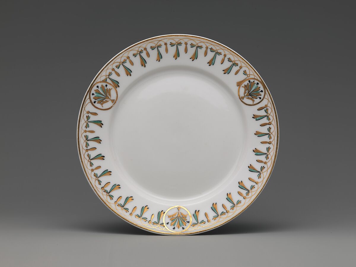 Union Porcelain Works was one of the most important and inventive American porcelain manufacturers in the second-half of the nineteenth century. In addition to their imaginative works designed by the German-born artistic director, Karl H. L. Müller, the firm’s mainstay was the production of heavy porcelain hotel dinnerware. This extensive service was made by Thomas Carll Smith, head of the Union Porcelain Works, as a gift to his daughter, Pastora Forest Smith Chace. The neoclassical decoration of the gilt bellflower and basket motif is complimented by turquoise enamel. Unlike the firm’s more eccentric and lavish designs created for their display at the Philadelphia Centennial Exposition in 1876, the pottery favored a more restrained classical style for their dinner services. This service descended in the Chace family.