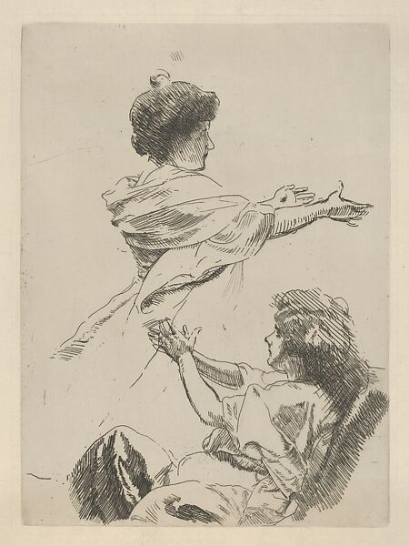 'L'Accueil' is a preporatory study for a painting by Besnard entitled l'Ile Heureuse which was hung at the Exposition Universelle in Paris in 1900. In the study, a woman reaches out her arms in a welcoming gesture at center; at bottom right, a seated girl claps her hands together,viewed in profile. The plate was made for la Société des Amis du Louvre who offered the prints to members in 1899.