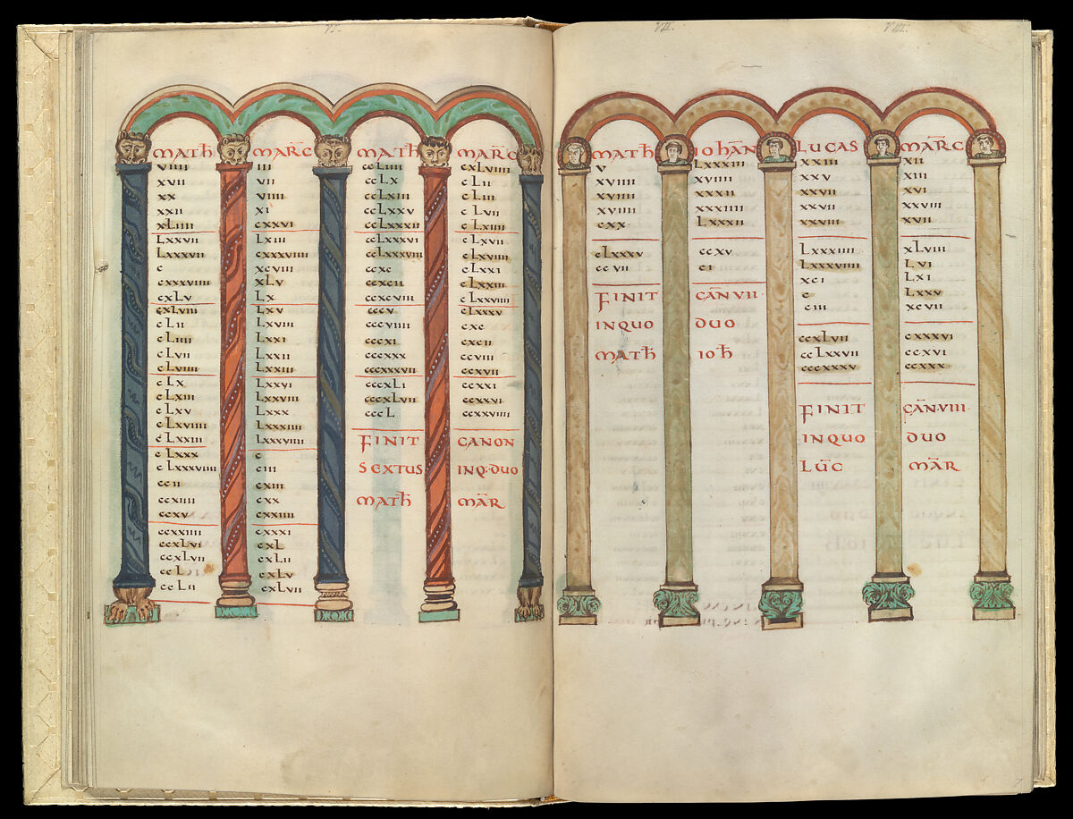 In this example, perhaps made for a queen, painted illumination is reserved for the Canon Tables, an elaborate concordance used to compare and contrast passages from the four gospel texts. Here, splendid arcades organize the essential information. The decoration is so varied and lively–to the point of whimsy at times–that turning the pages approximates an extraordinary architectural tour.