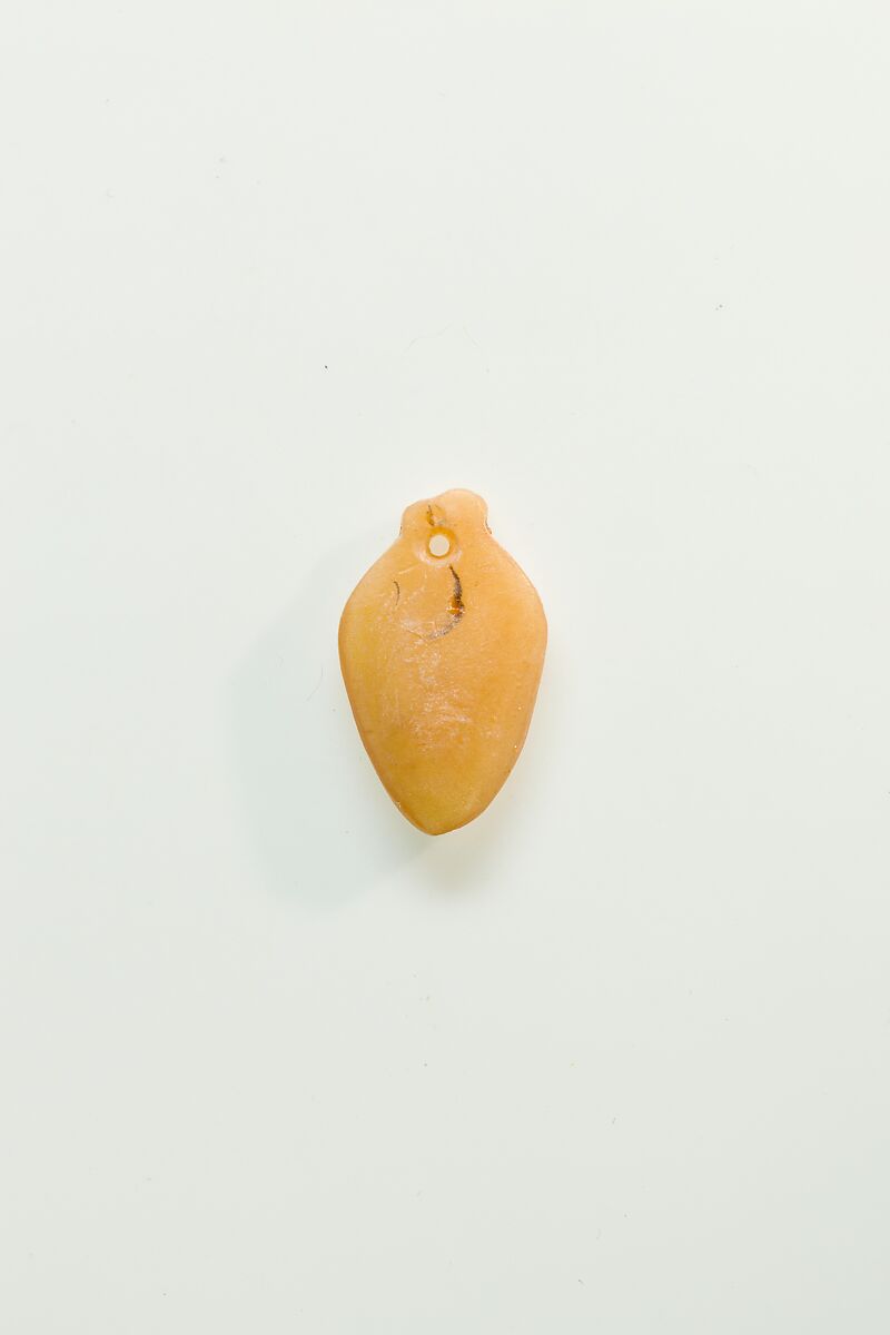 Nine amulets of various materials were found threaded together in a tight group around the throat of the Lady Djedmutesankh; two of these, of green glass, disintegrated after they were discovered. This amulet represents a human heart, considered by the ancient Egyptians the center of intelligence and emotion.