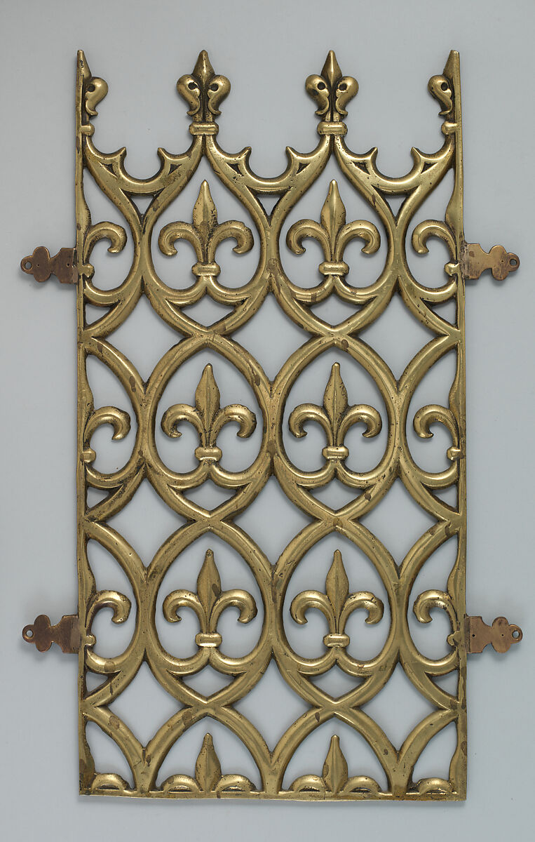 These decorative grill panels exemplify the designs of Augustus Welby Northmore Pugin (1812–1852), who was the leading exponent of the Gothic Revival style in England. Pugin’s work is central to the transformation in British design that began in the mid-nineteenth century. He admired what he saw as the honesty and purity of medieval art, and deplored the meaningless repetition of historical motifs. Pugin coined the phrase "Brumagen Gothic," referring to "those inexhaustible mines of bad taste, Birmingham."